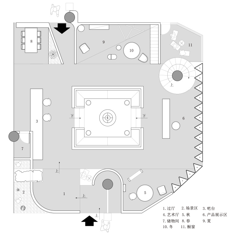 设计师深谙园林造景的精髓,微水泥压低了走道的整体亮度,让空间内的饱满色彩与敞亮的天幕得到较大化的展示,路过的人都忍不住一窥究竟。