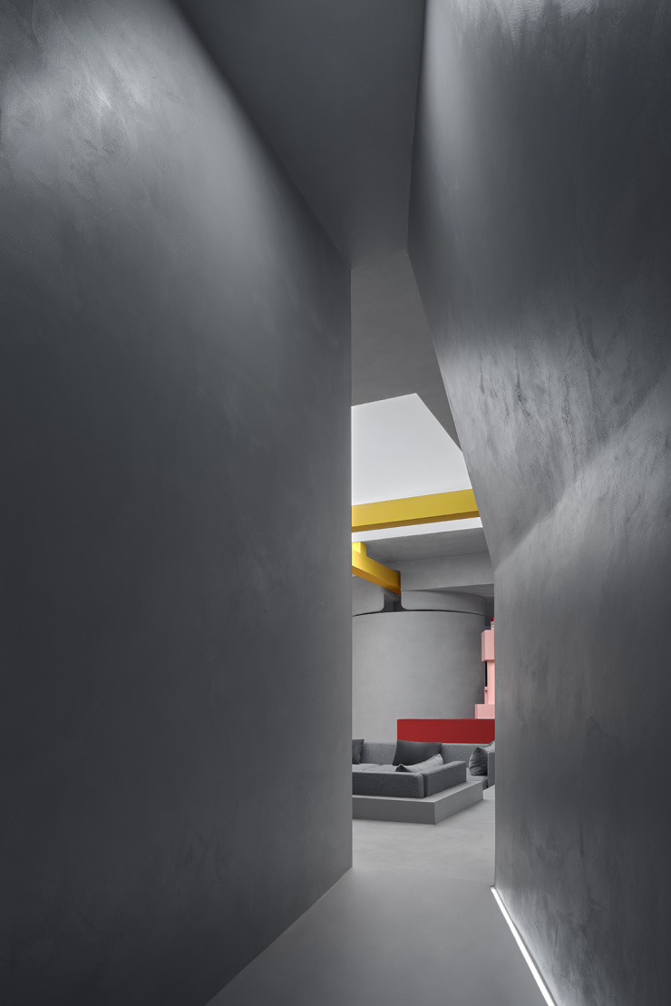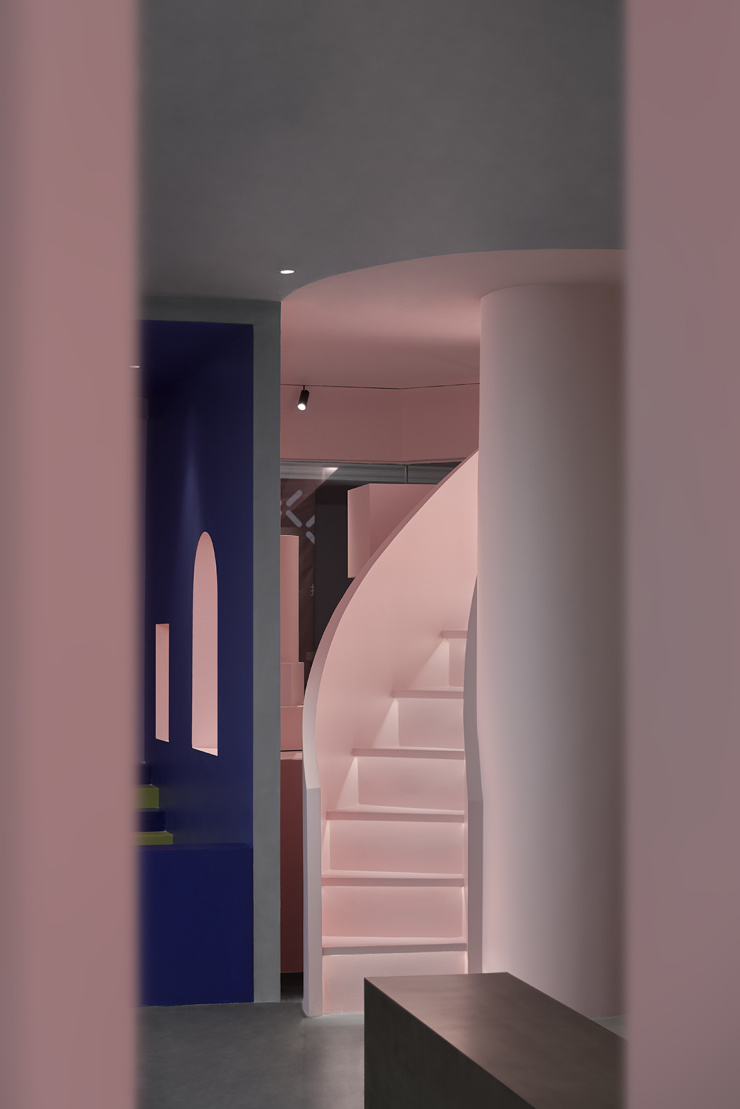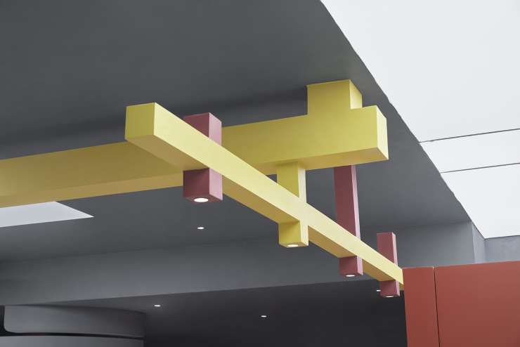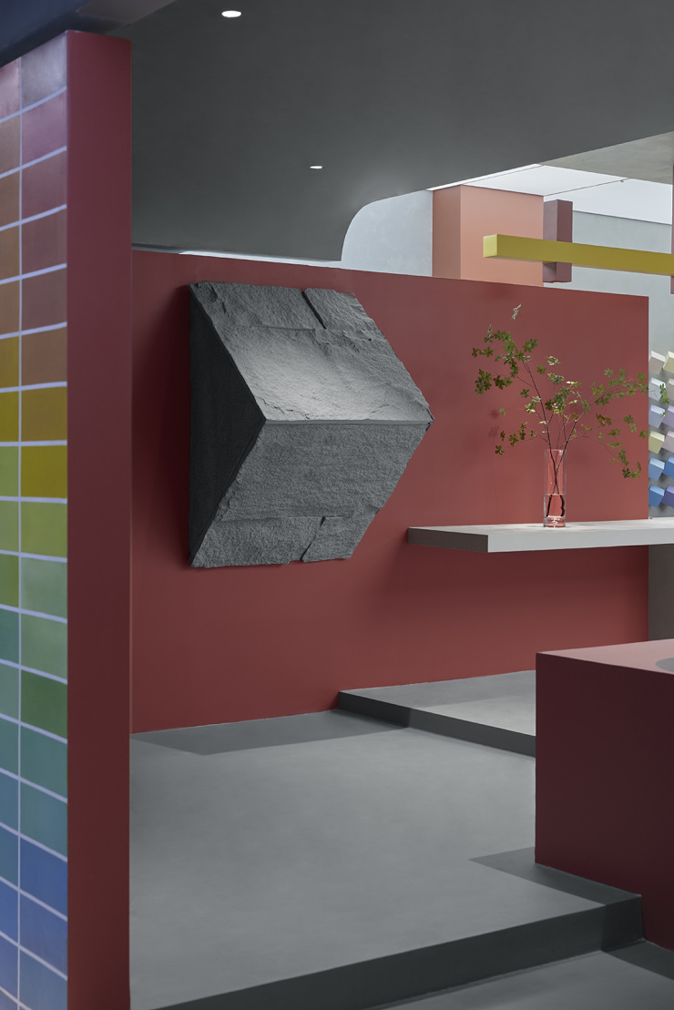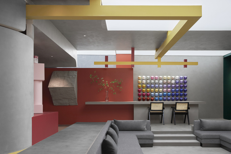 贯穿整体空间的微水泥提供了中性而沉稳的灰色基调,让缤纷色彩在空间内获得收敛与平衡,升华了整体空间的艺术感。