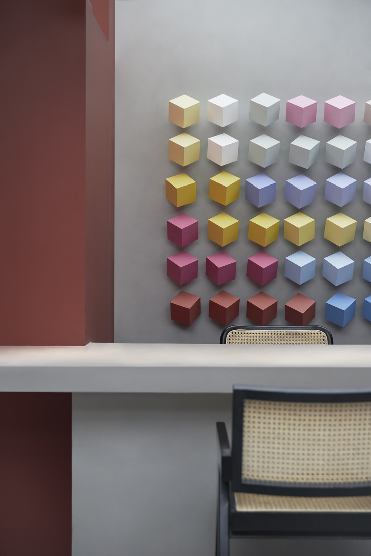 前台的魔方背景墙,仿佛一幅现代主义装饰画。空间内容主题的色彩属性、结构主题的魔方属性,在这里得到最浑然天成的交织与对话,一切都那么优雅而内敛、润物细无声。