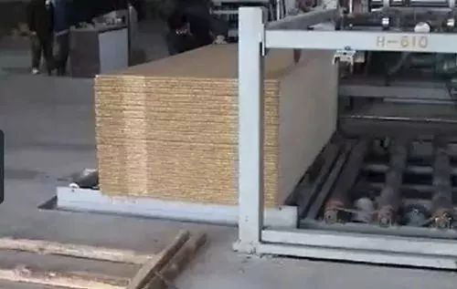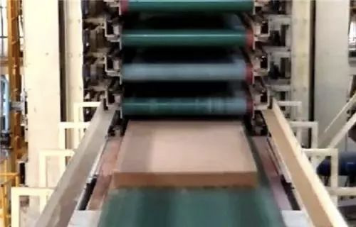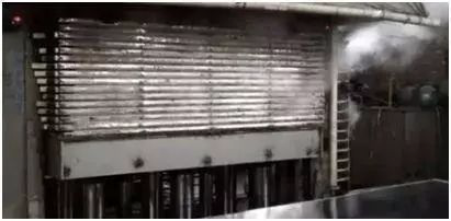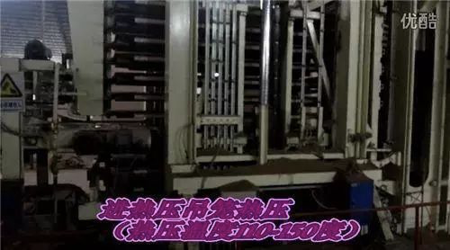 然后把厚板块送进多层吊笼,一层一块,在100多度的高温下热压,压力通常5兆帕, 就是5个压,把木粉末压紧实。