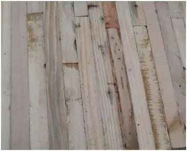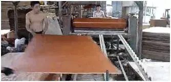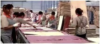 上图可以看出小木条之间都有胶的痕迹。在生产中也有芯层木条间不施胶的,只对两层表板施胶,那样胶量会少很多。上下两面还会加上涂胶的板子,然后进行热压,最后成品。