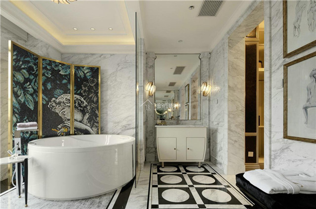 卫浴间处于一个潮湿的环境中,对于材料的防水和防潮要求极高,大理石的防水防潮的性能无疑是客户和设计师的优选,不仅满足了防水防潮,装饰效果也优质,很大程度上美化了空间。大理石的自身纹样颜色装饰起来雍容华贵,凸显卫浴空间的高贵品质。