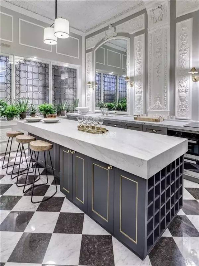豪宅别墅的厨房设计装修使用大理石来装饰不仅奢华大气,而且优雅时尚,厨房设计以开放式尤佳。例如水墨石、它是经抛光处理,表面光亮如镜,质感强烈,有华丽高贵的装饰效果。