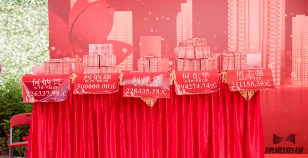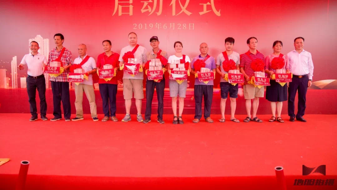 10位已签约交房的村民代表上台,广州市景腾房地产投资有限公司刘裕兴董事长逐一发放拆迁奖励和一年临迁费。一村民本次发放较高得到将近60万。