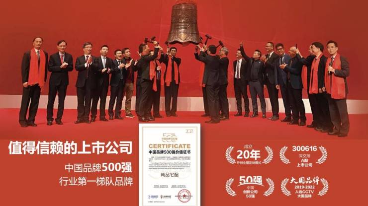 2017年,登陆中国A股市场,成为定制家居行业上市企业; 2019年,入选CCTV大国品牌;2021年,推出BIM整装技术,打造中国装修行业服务新标准,与京东达成战略合作;2023年,推出随心选全屋定制新模式,通过专业设计+个性定制+整体搭配,让消费者随心选品、明白消费,开创定制新模式;2024年,打造Ai设计工厂,推动家居行业的商业模式变革。