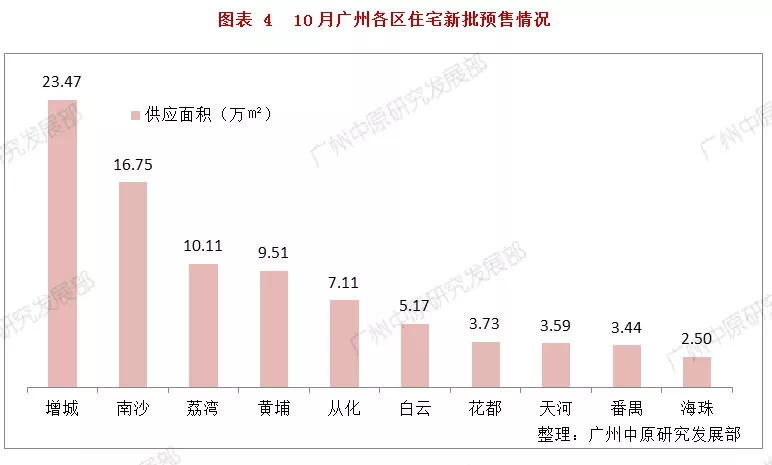从区域情况来看,10月供应仍以增城、南沙两区为主要支撑,两区累计提供40.22万㎡新批面积,占总供应量近一半水平。