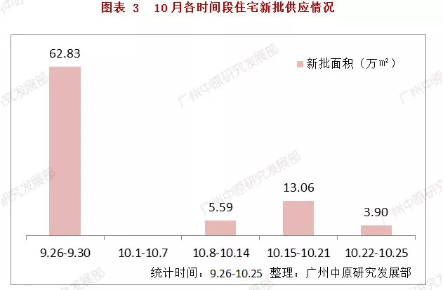 10月统计时段(9.26-10.25)中,国庆前(9.26-9.30)新批预售量为62.83万㎡(5831宗),占10月供应量的74%。
