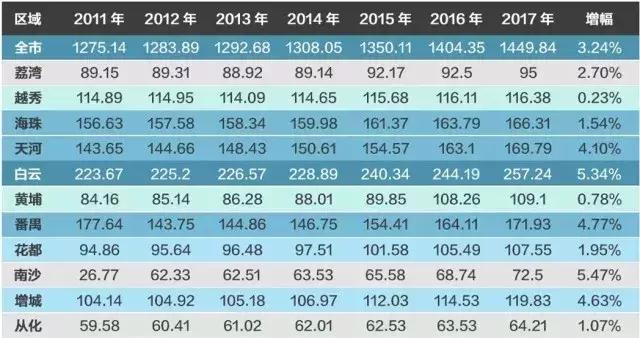 根据广州统计局发布2017年的人口数据,白云、番禺、天河依旧是稳居前三的人口大区;而从增幅来看,番禺、白云、增城位居前三,增长潜力巨大;另外,去年番禺户籍人口增加了4 .8万人,是户籍人口增加最多的区域。