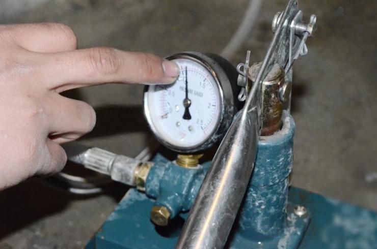 第二步:测压方法是把冷热水管连接在一起,试压器接在任一出水口,压力指针都为零。当所有水管通路都焊接好了才可以试压,测压时,摇动千斤顶的压杆。