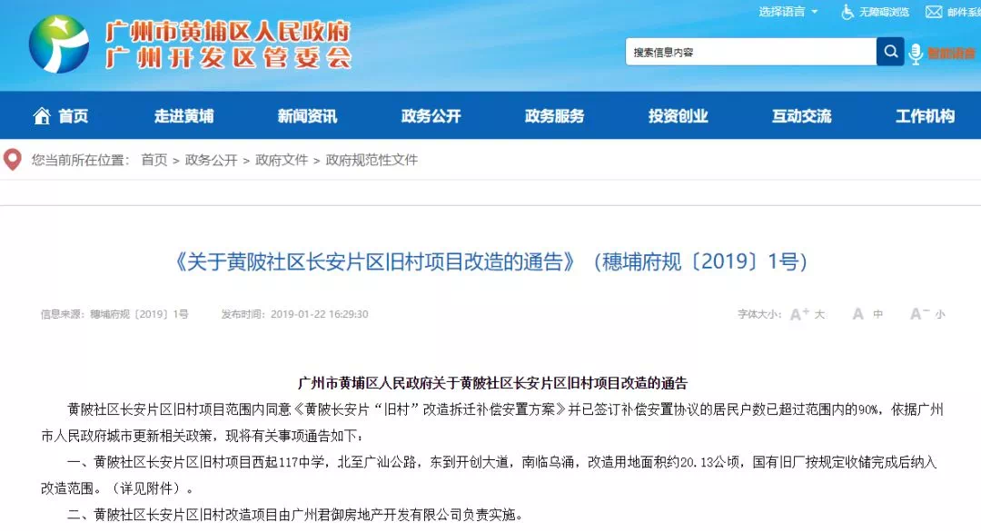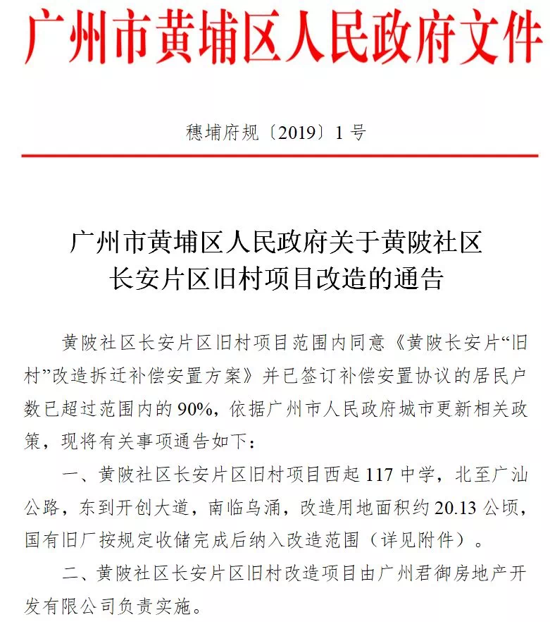 今年1月22日,黄埔区人民政府官网发布《关于黄陂社区长安片区旧村项目改造的通告》(穗埔府规〔2019〕1号)。