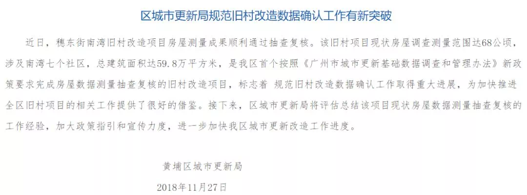 此外,南湾村是黄埔区排名前列按照《广州市城市更新基础数据调查和管理办法》新政策要求完成房屋数据测量抽查复核的旧村改造项目。