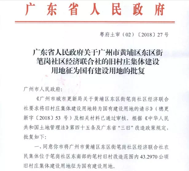2018年11月2日,广州市黄埔区政府发布一则征地公告称,经广州市人民政府批准(粤府土审(02)〔2018〕27号文),需将广州市黄埔区东区街笔岗社区经济联合社共43.2970公顷旧村庄集体建设用地转为国有建设用地。
