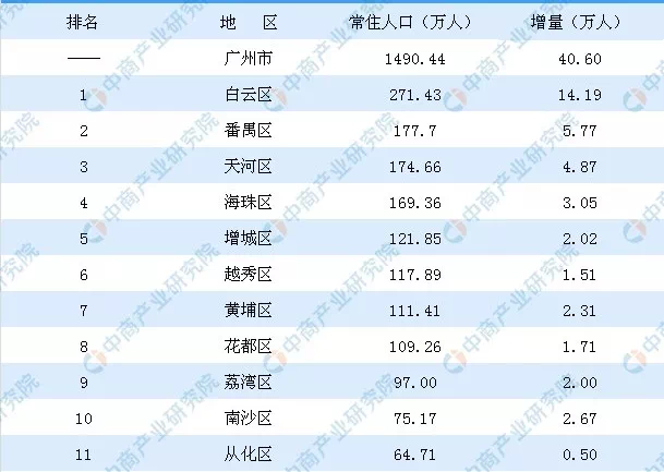广州2018年各区常住人口总量排行榜