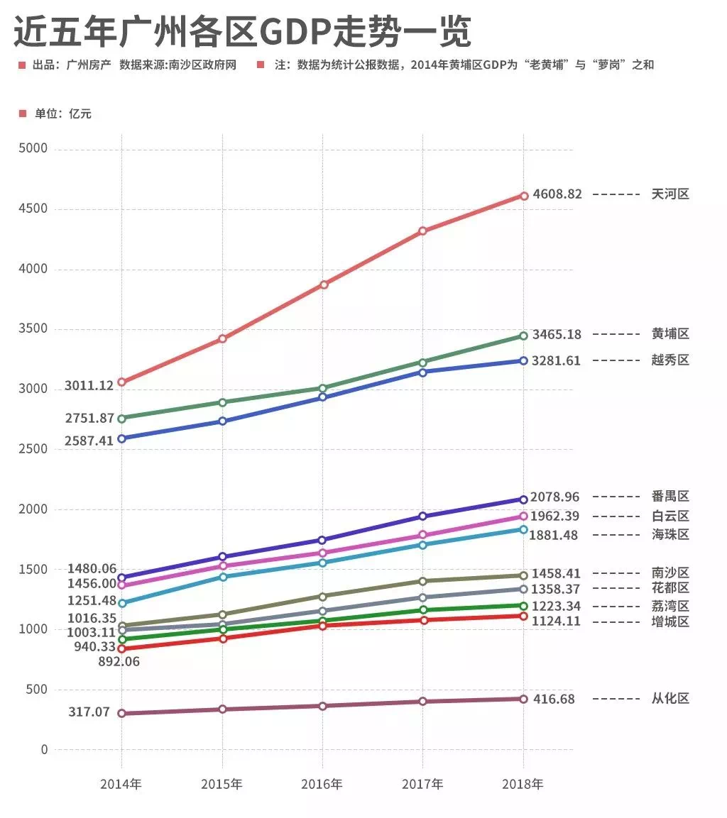 根据南沙区政府官网日前公布的2018年度广州各区的经济数据显示,作为广州“经济排名前列区”的天河表现依然亮眼,以4608.8178亿元GDP总量和9.2%增长率夺得“双料冠军”,黄埔区、越秀区分别以3465.18亿元、3281.61亿元位列亚、季军。