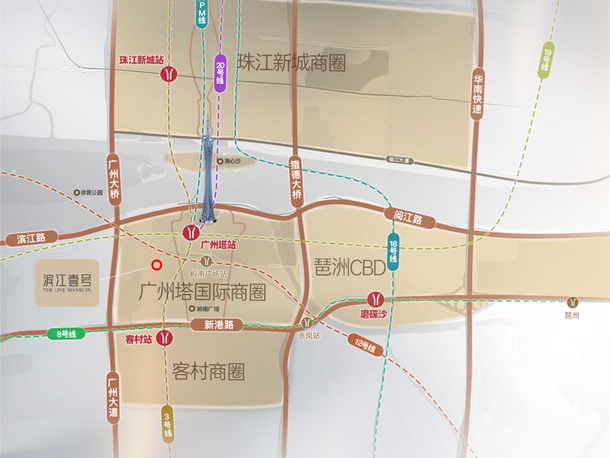 项目正处在广州塔-琶洲商圈内,距离珠江新城、琶洲电商CBD都在2公里范围内,开车走广州大道、猎德大桥,最快10分钟即达;也可以经海心桥步行过江,所以,无论开车、地铁、步行都非常方便。