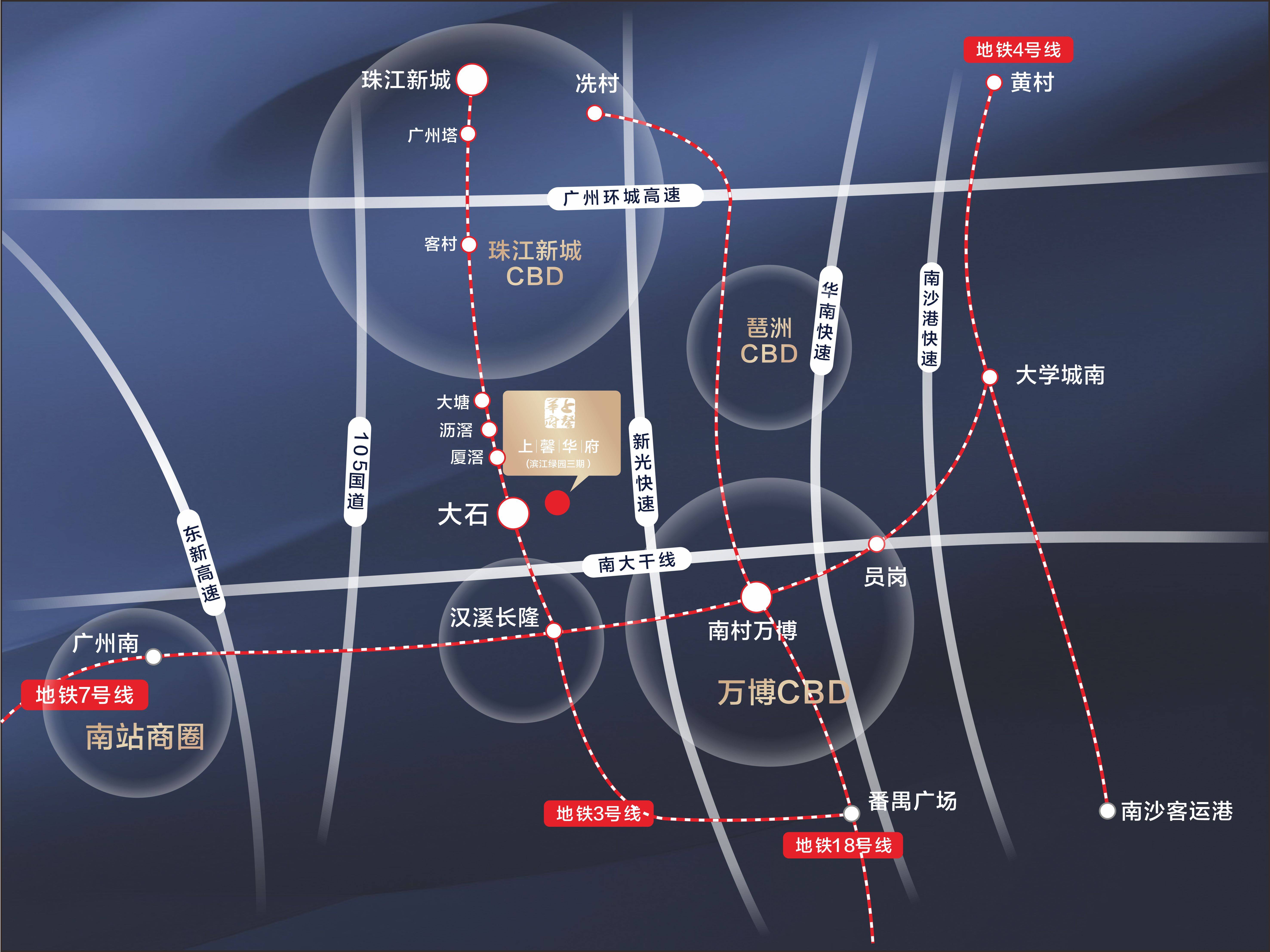 (1)距珠江新城CBD直线距离约10公里,3号线大石-珠江新城6站地铁直达无需接驳,无缝接轨都市高效生活圈