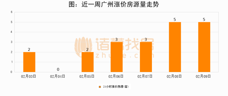 根据诸葛找房数据显示,广州24小时涨价房源量为5套,较02月08日持平。