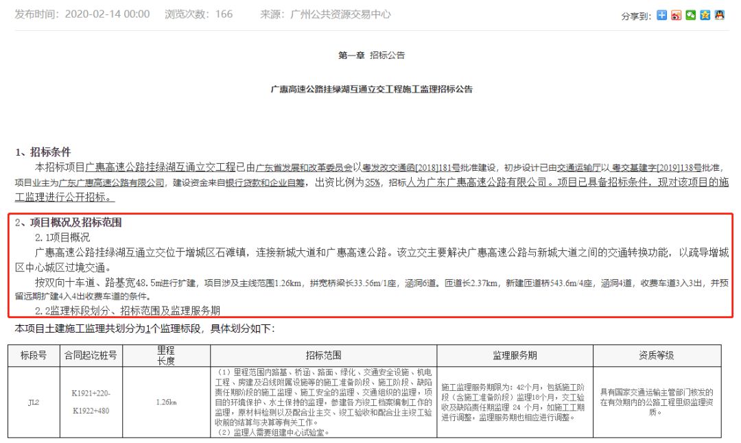 根据较新的招标,在2月14日广惠高速公路挂绿湖互通立交工程再次招标。