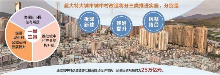 根据住建部说明,本轮超大特大城市城中村改造,分三类推进实施。一类是符合条件的实施拆除新建,另一类是开展经常性整治提升,第三类是介于两者之间的实施拆整结合。