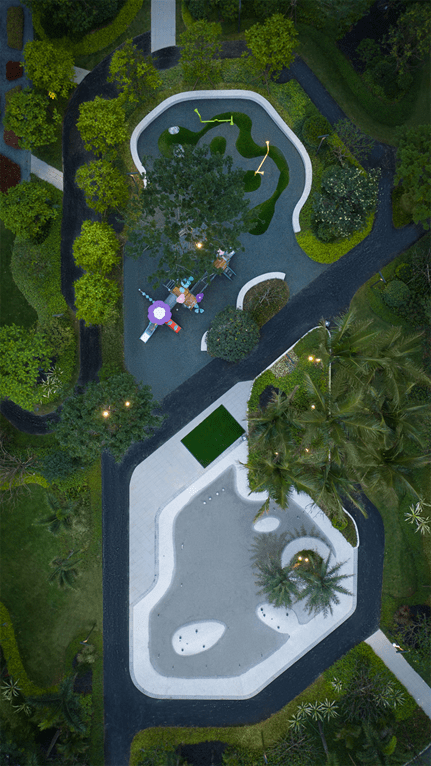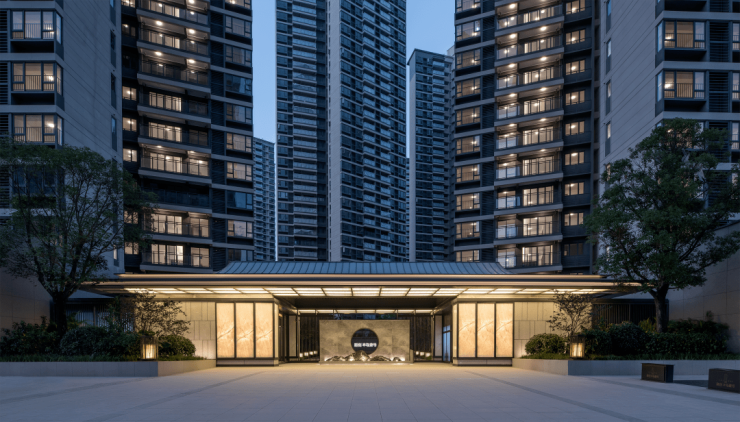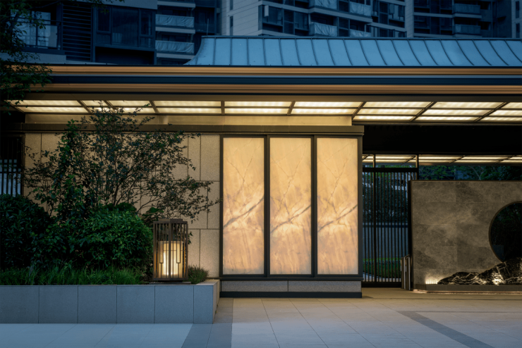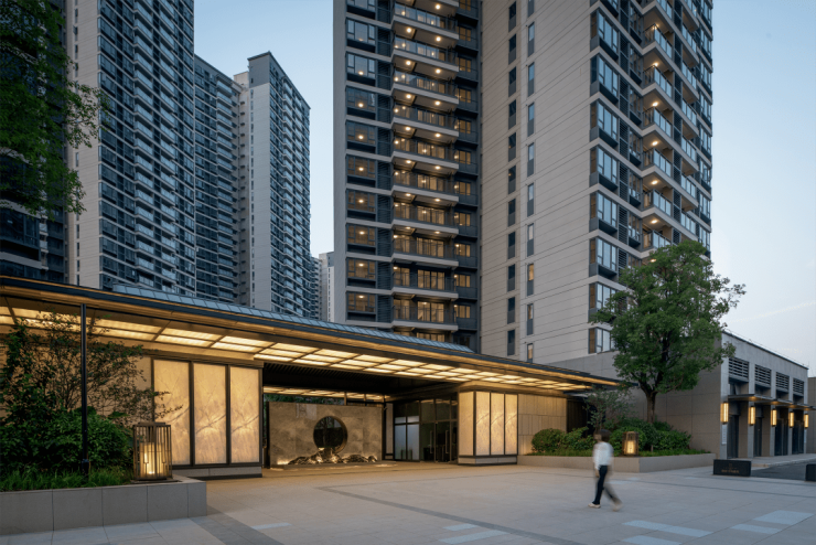 项目取意岭南传统名园格局的景观,依托滨江水景打造了“一轴、一环、一廊”园林空间,以景观主轴串联起各个美学空间。