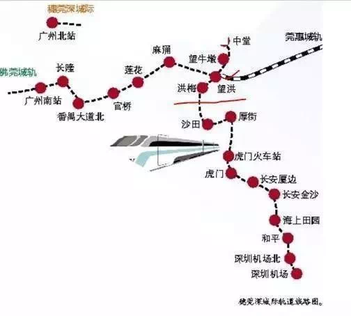 穗莞深城际线是珠三角城轨的主干线,起点是广州北站,在广州境内有白云机场、增城开发区、新塘等共15个车站,东莞境内有10个车站,最后进入深圳市区,设深圳机场北、深圳机场等4个车站。