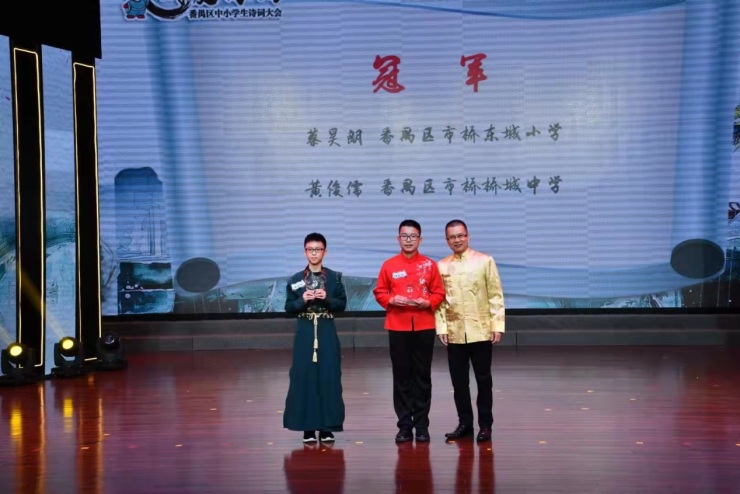 决赛现场精彩迭出,高潮不断,参赛的中小学组12名选手沉着机智,妙语连珠,展现了良好的诗词文化素养和竞技精神,经过群雄逐鹿、飞花探榜、诗画争锋三个环节的比拼,最终市桥桥城中学黄俊儒同学、市桥东城小学蔡昊朗同学分别摘取中、小学组桂冠。