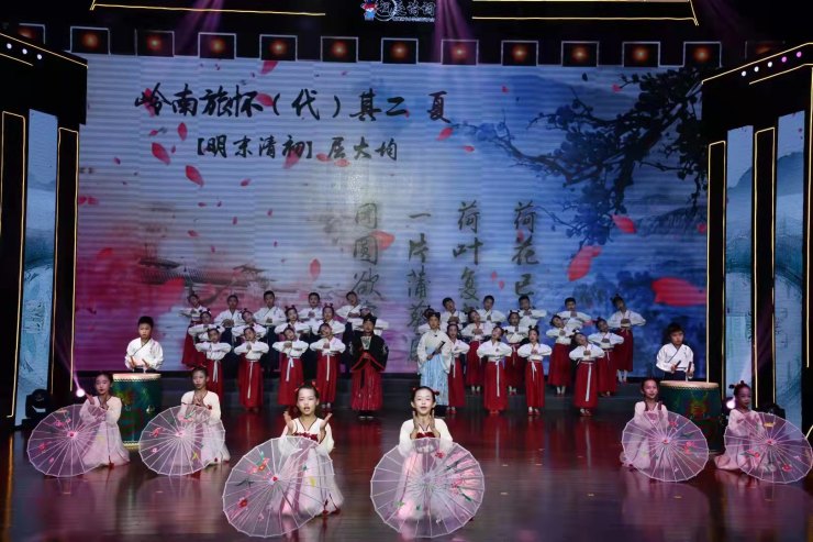 决赛过程中,主办方精心编排了优秀诗词节目展演环节,四个获得诗词节目选拔赛一等奖的作品华丽登场,有充满童真童趣的民歌童谣传唱,慷慨激昂的红色诗词朗诵,富含岭南特色的粤语吟诵,特别是番禺执信中学附属小学带来的《但愿人长久》,节目融合了朗诵、歌唱、舞蹈、京剧、rap等多种艺术形态,其创新性和丰富表现力收获现场以及观看直播观众的不少点赞、好评。