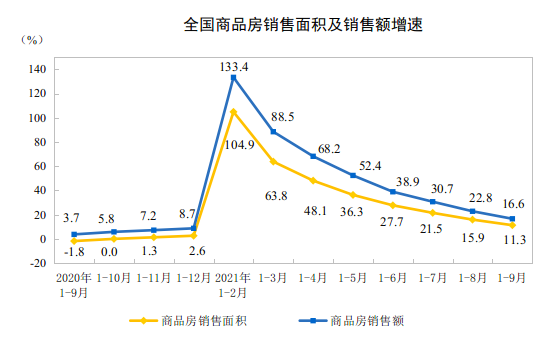 国家统计局数据显示,1~9月份商品房销售面积130332万平方米、销售额134795亿元,同比分别增长11.3%和16.6%;与2019年1~9月份相比分别增长9.4%和20.9%。其中,住宅销售面积增长11.4%,住宅销售额增长17.8%。
