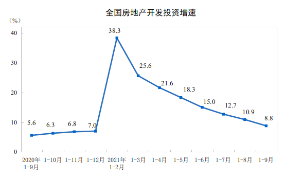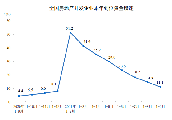 10月18日,国家统计局公布的《2021年1~9月份全国房地产开发投资和销售情况》显示,前9个月全国商品房销售13.5万亿元,同比增长16.6%;房地产开发投资11.3万亿元,同比增长8.8%;房企到位资金增幅持续放缓,其中国内贷款连续4个月同比下降。