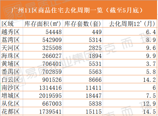 据克而瑞监测,区域整体而言,截至5月底商品住宅去化周期低于7个月的有4个区域:黄埔区、番禺区、南沙区以及越秀区。从去化周期长短看,黄埔区去化周期最短,为3.7个月,花都区的去化周期最长,达14.5个月。从距离中心远近看,中心四城区越秀、荔湾、海珠、天河区的去化周期均低于10个月,外围的从化区和花都区去化周期分别达到12.9个月和14.5个月。