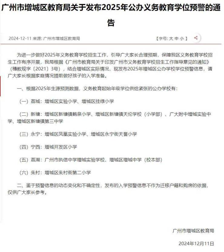 增城区教育局强调,鉴于预警信息的动态变化和不确定性,发布的入学预警信息不作为迁移户籍和购房的依据,仅供广大家长参考。