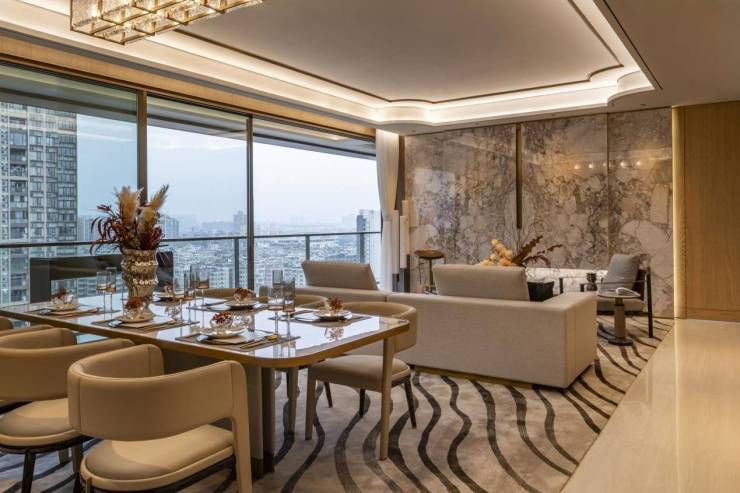除此以外,为了匹配项目定位,新城市领院在立面设计和选材用料方面都是花了不少心思的。不仅都采用了全球顶级材料和设计理念,特邀汉森伯盛、普邦园林、矩阵纵横等行业翘楚亲自操刀;而且还进行全球选材,力求最大程度地还原效果图。公共区域的入户大堂是进口的爵士白天然大理石;电梯间背景墙则是来自巴西热带雨林的亚马逊绿大理石岩板;而户型内部更是装修豪华,如潘多拉奢石玄关墙身、铂尔曼白电视背景墙等,为住户带来无与伦比的尊贵体验。