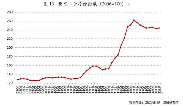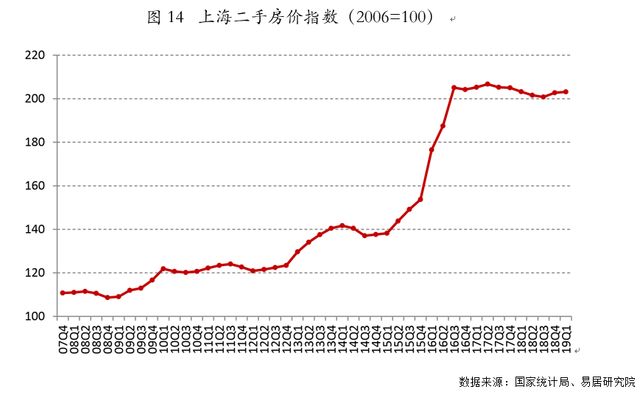 回顾历史数据,近十年北京和上海房价指数总体上行,基本是大涨小跌,并且上涨的时间要长于下跌的时间。房价指数的上涨,主要是由于国内经济的持续增长,京沪人口大量流入,居民因为投资渠道较少而将资产主要配置在房产上。从2017年二季度至2019年一季度,北京和上海的房价指数均被遏制住了快速上涨的势头,进入震荡盘整期。北京的房价指数由2017年一季度的261.9下跌至2019年一季度的244.2,下跌6.8%。2016年三季度至2017年四季度,上海的房价指数在205点左右盘整了6个季度,2018年前三季度缓慢下跌,四季度以来小幅上涨,2019年一季度相比2017年二季度的高点下跌了1.7%。