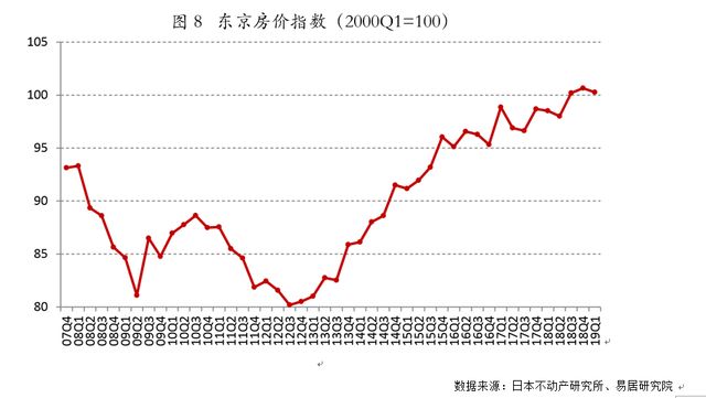 观察历史数据,东京房价指数从2007年四季度的93.1下跌至2009年二季度的81.1,随后触底反弹,上涨至2010年三季度的88.6,之后又步入到下行通道,于2012年三季度触底,房价指数跌至80.2,然后房价指数开始震荡上行,于2017年一季度反弹至近10年高点,此后两个季度东京房价出现了小幅回调,2017年四季度至2018年四季度继续震荡上行,2019年一季度小幅下行。2012年开始的这波行情主要是因为日本政府推出量化宽松政策后,东京的房地产市场需求有所释放,并且由于成功申办2020年东京奥运会,还吸引了包括中国买家在内的许多外国投资者。