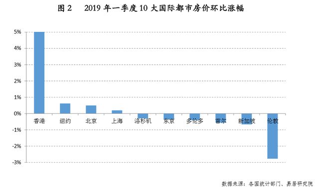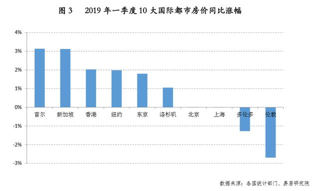 根据各国统计部门的数据,与2018年四季度相比,2019年一季度10大国际都市中,房价上涨的城市有4个,下跌的城市有6个。