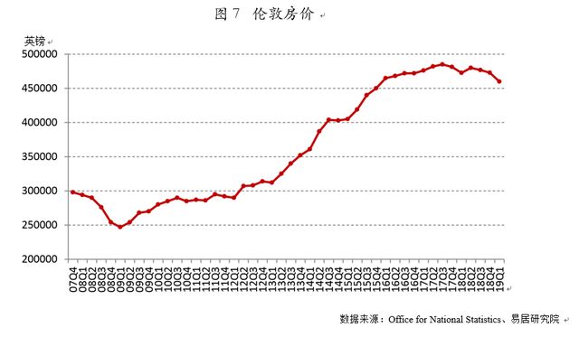 历史统计数据显示,全球金融危机爆发前后,伦敦房价从2007年四季度的£300000左右下跌至2009年一季度的£247000,由于英国政府实施经济刺激计划,英国经济开始复苏,伦敦房价触底反弹,从2009年开始进入上行通道,至2017年三季度依然维持着上行趋势。自2017年四季度开始,伦敦房价连跌两个季度,2018年二季度小幅回升,三季度开始继续下跌,目前已连续3个季度下跌。2019年一季度伦敦房价£459800,与房价高点£485000(2017年三季度)相比,下跌5.2%。伦敦的房价存在被高估的现象,市场本身已被透支,同时脱欧带来的政治和经济的不确定性也对房地产市场造成了影响。英国2018年全年国内生产总值(GDP)增长1.4%,为2012年以来较低增幅。预计2019年二季度伦敦的楼市会继续保持振荡下行走势。