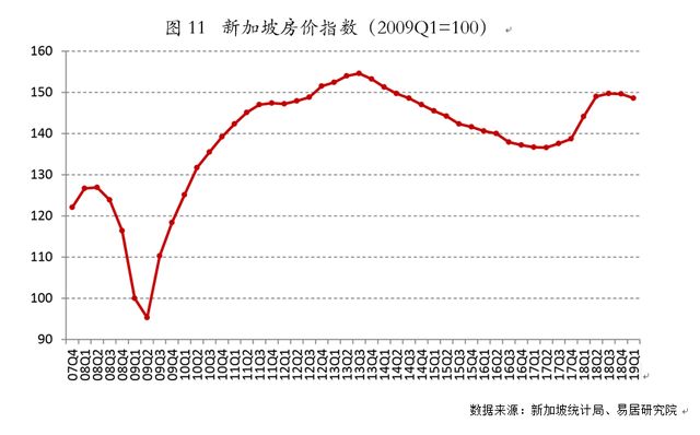 回顾历史数据,从2007年四季度至2008年三季度,新加坡房价保持了小幅上涨之后,受金融危机影响开始大幅下跌,跌势一直到2009年二季度。之后新加坡房价开始回暖并持续上涨,一直持续到2013年三季度左右。这期间房价上涨的原因主要是美国推行QE,在全世界低利率的影响下,大量热钱涌入新加坡房地产市场。为了遏制房价过快上涨的势头,新加坡政府采取楼市管控政策,房价应声下跌,跌势一直从2013年四季度持续到2017年二季度。直到2017年,新加坡对房地产市场的管控措施才有所松动,2017年三季度开始,新加坡房价出现回暖,2018年一二季度涨幅有所扩大。为抑制房价,2018年7月,新加坡上调上调额外买家印花税税率5–15个百分点,并收紧贷款限额,随后三季度房价涨幅收窄,四季度微幅下跌,上涨势头得到控制。2019年一季度,新加坡房价继续小幅下跌,预计2019年全年新加坡房价将趋稳。