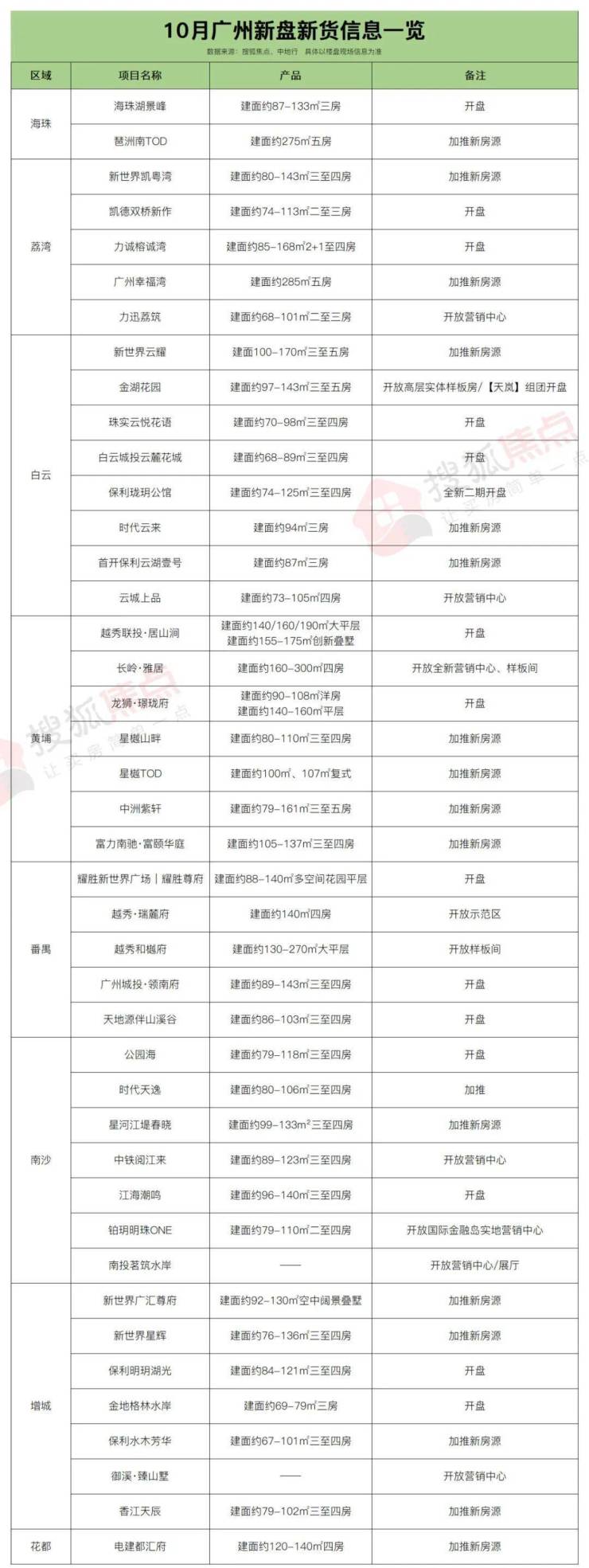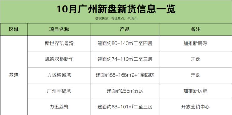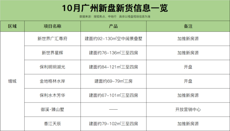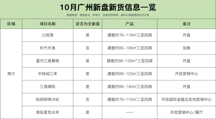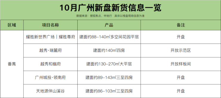 据搜狐焦点不完全统计,即日起至10月底,广州全市约42盘有动作,其中全新盘不少,高达21个,集中为开盘销售,部分为开放营销中心、样板间等。