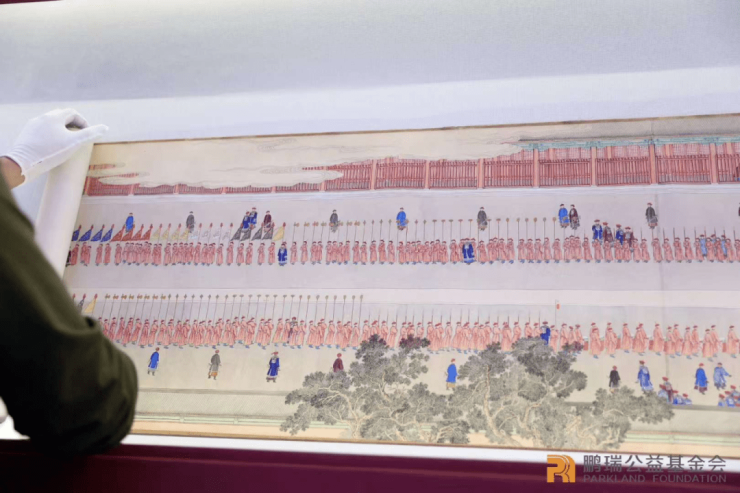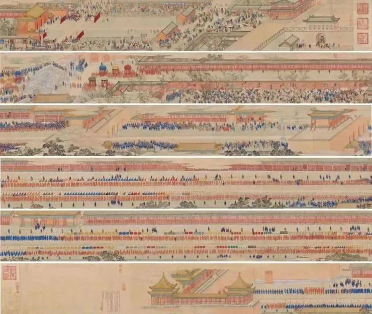 国宝名卷《盛世迎祥·西域献礼图》是乾隆时期清朝宫廷纪实绘画之佳作,由宫廷画家徐扬所绘。画卷全长达18.65米,人物超过8000人,记载入画有50余个国家,详细描绘了乾隆二十五年正月从天安门至午门的庆典场面,着重展示了大清门到正阳门之商业繁荣、各国来华文化交流之盛况、皇家仪仗气势之威严三大场景,是乾隆盛世的国家形象纪录片,栩栩如生地呈现了清代的北京城,把这一个历史重要时刻以画卷的形式永久定格。