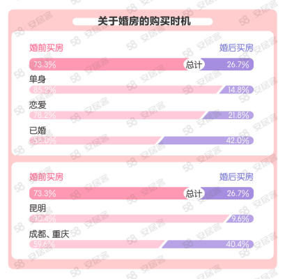 “婚前买房”几乎是单身男女的“执念”。调研显示,85.2%的单身年轻人希望婚前购房,特别是昆明选择婚前买房的年轻人占比超过90%;而更讲究“巴适”“随意”的成都、重庆,超过40%的受访年轻人同意婚后购房。另有36.7%的受访年轻人要求更高,希望结婚时“房车俱全”。