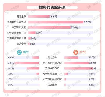 东莞、南京超过30%的受访年轻人表示男方全款买房。而昆明、重庆约70%的受访年轻人选择男方首付,双方共同还款。整体来看,近六成受访年轻人称婚房由男方全款或提供首付,32.6%的人愿意双方共担,女性愿意共同购买婚房的占比超过男性。