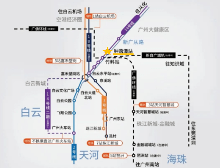 未来从钟落潭出发,可轻松5站地铁到达嘉禾望岗,5站到琶洲,3站智慧城,可快速抵珠江新城等繁华商圈。