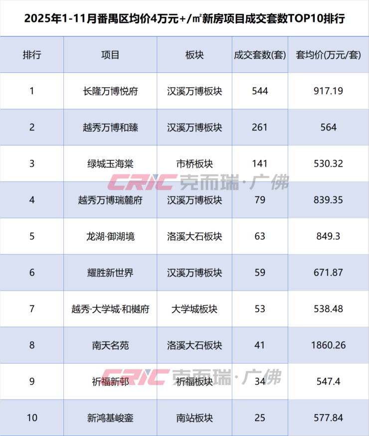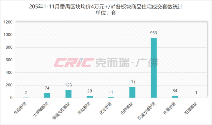 具体到板块上,克而瑞数据监测显示,2025年1-11月番禺区4万元+/㎡新房成交主力项目为汉溪万博板块,共成交953套,区占比68%。