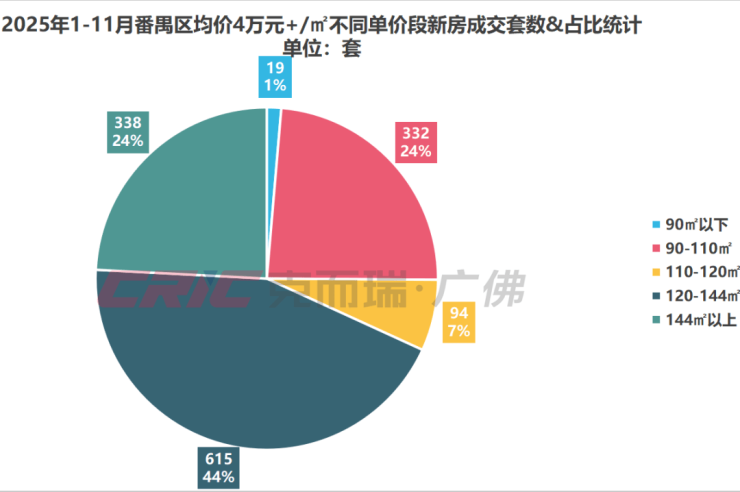 产品类型方面,克而瑞数据监测显示,2025年1-11月番禺区均价4万元+/㎡新房成交主力户型为120-144㎡,共成交615套,占比44%,较去年全年提升1%,其次是90-110㎡与144㎡以上,二者成交占比相同,均为24%;其中90-110㎡成交占比较去年全年扩大4%,144㎡以上户型成交占比与去年持平。