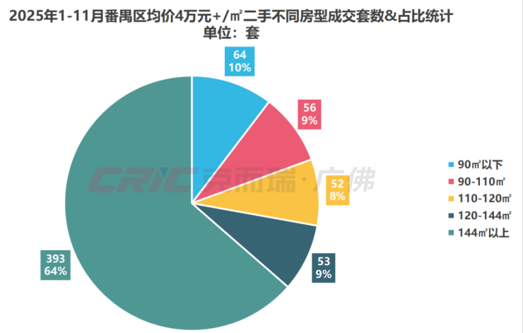 也正因如此,克而瑞数据监测,2022-2025年,144㎡以上户型成为番禺均价4万元+/㎡二手房主力成交,年均成交突破百套,其中今年成交393套,占比64%。