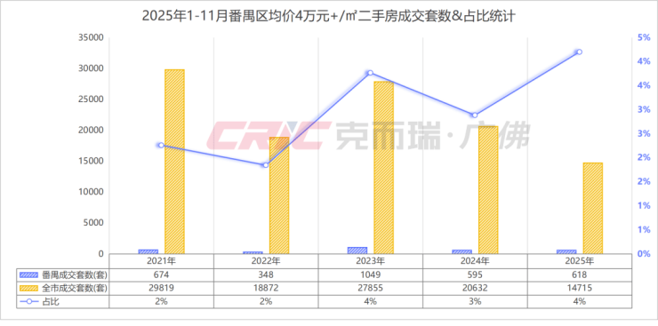 在二手房上,克而瑞数据监测显示,2025年1-11月番禺区均价4万元+/㎡成交618套,较去年全年微增4%。