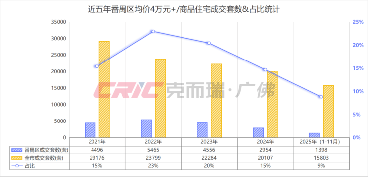克而瑞数据监测显示,2025年1-11月番禺区4万元+/㎡新房市占率9%,较2022年高峰时期减少14%。