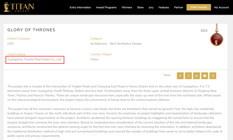 TITAN Property Awards (TITAN 地产奖)作为当今著名的地产大奖之一,旨在表彰房地产开发、室内设计、建筑、景观设计和营销领域的最高成就,所有获奖作品皆为全球各地经过严格遴选的卓越地产设计作品,素有地产界“奥斯卡奖”的荣誉美称。