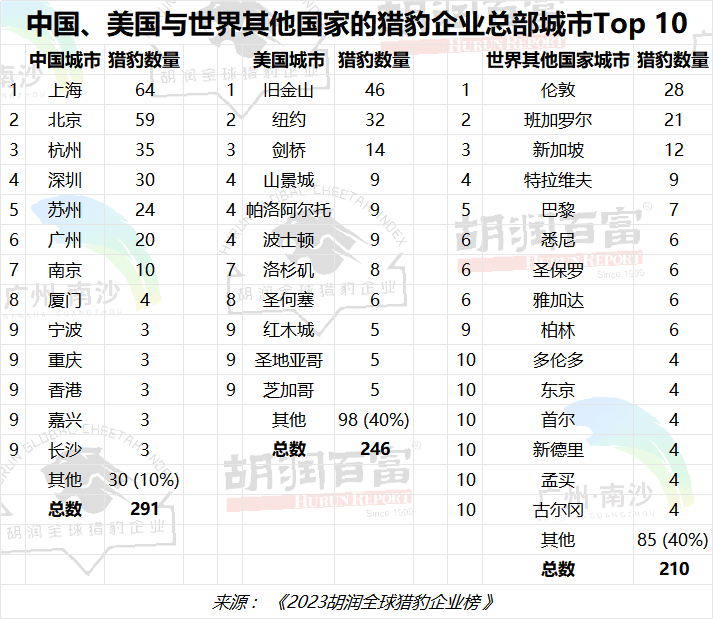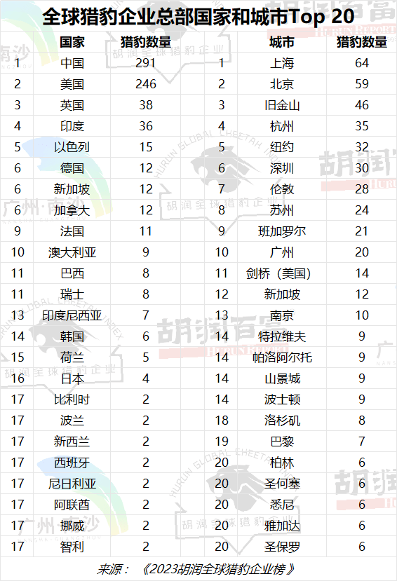 榜单显示,胡润研究院在全球34个国家198个城市共找到747家猎豹企业。其中,中国和美国分别以291家和246家领先,占全球猎豹企业总数72%;而上海成为全球猎豹企业之都,拥有64家猎豹,其次是北京(59家)和旧金山(46家);