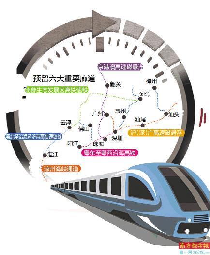 值得注意的是,《规划》还提出,要预留六大重要廊道,包括京港澳高速磁悬浮、沪(深)广高速磁悬浮,粤北至沿海经济带高快速铁路、琼州海峡通道、粤东至粤西沿海高铁、北部生态发展区高快速铁路。
